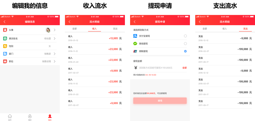 2、我的信息、收入、支出、提現(xiàn)等