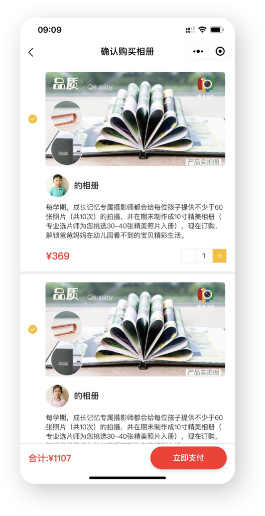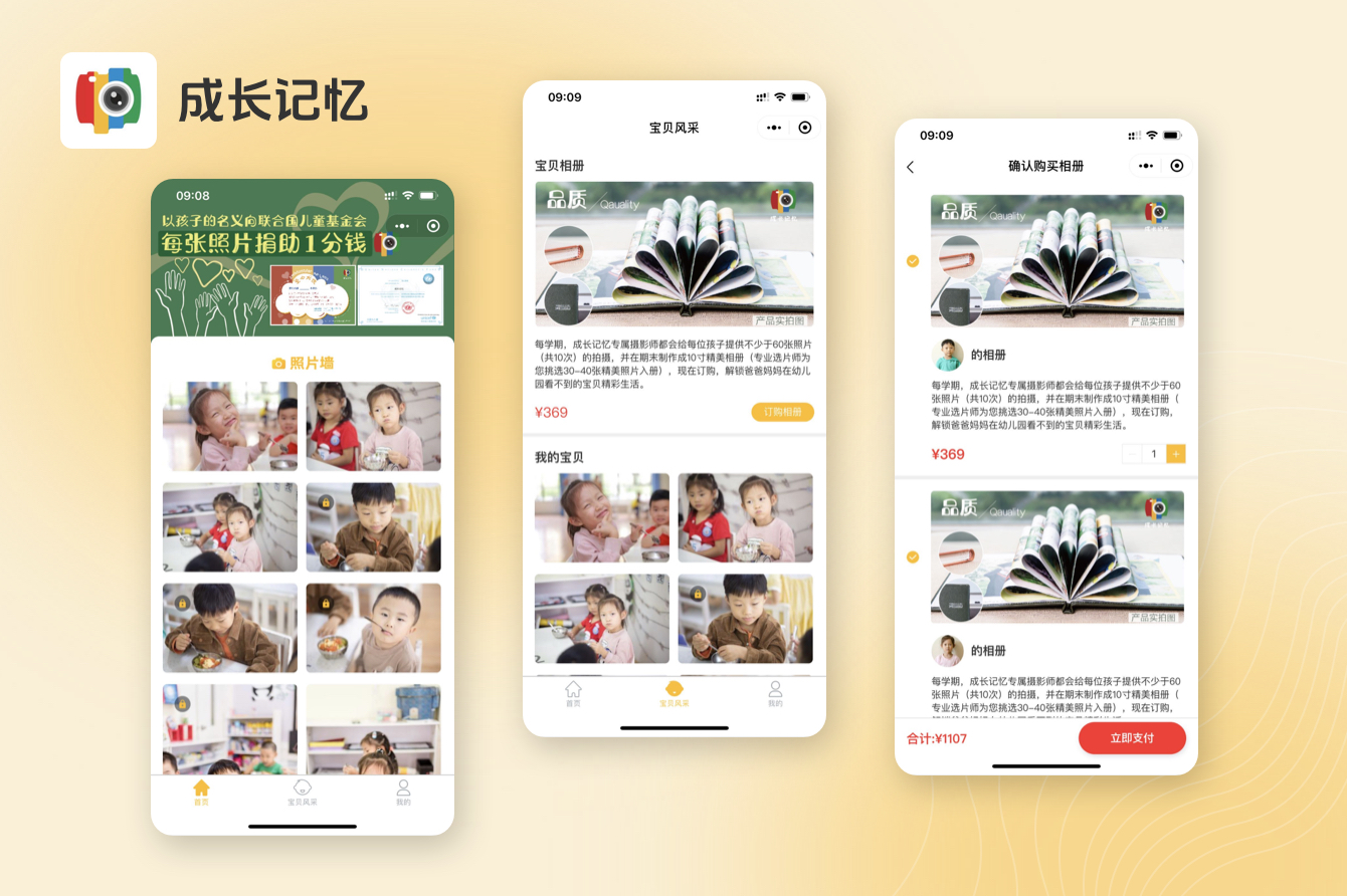 3、家長(zhǎng)可以進(jìn)行相冊(cè)的購(gòu)買(mǎi),成長(zhǎng)記憶提供照片精修入冊(cè):