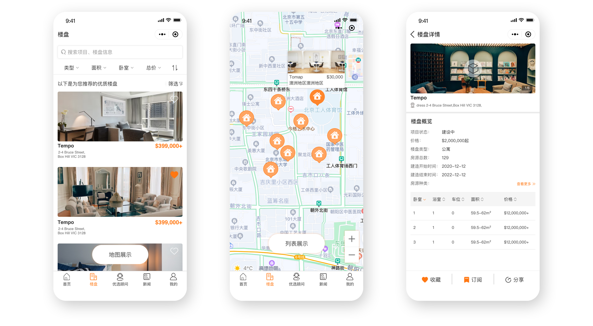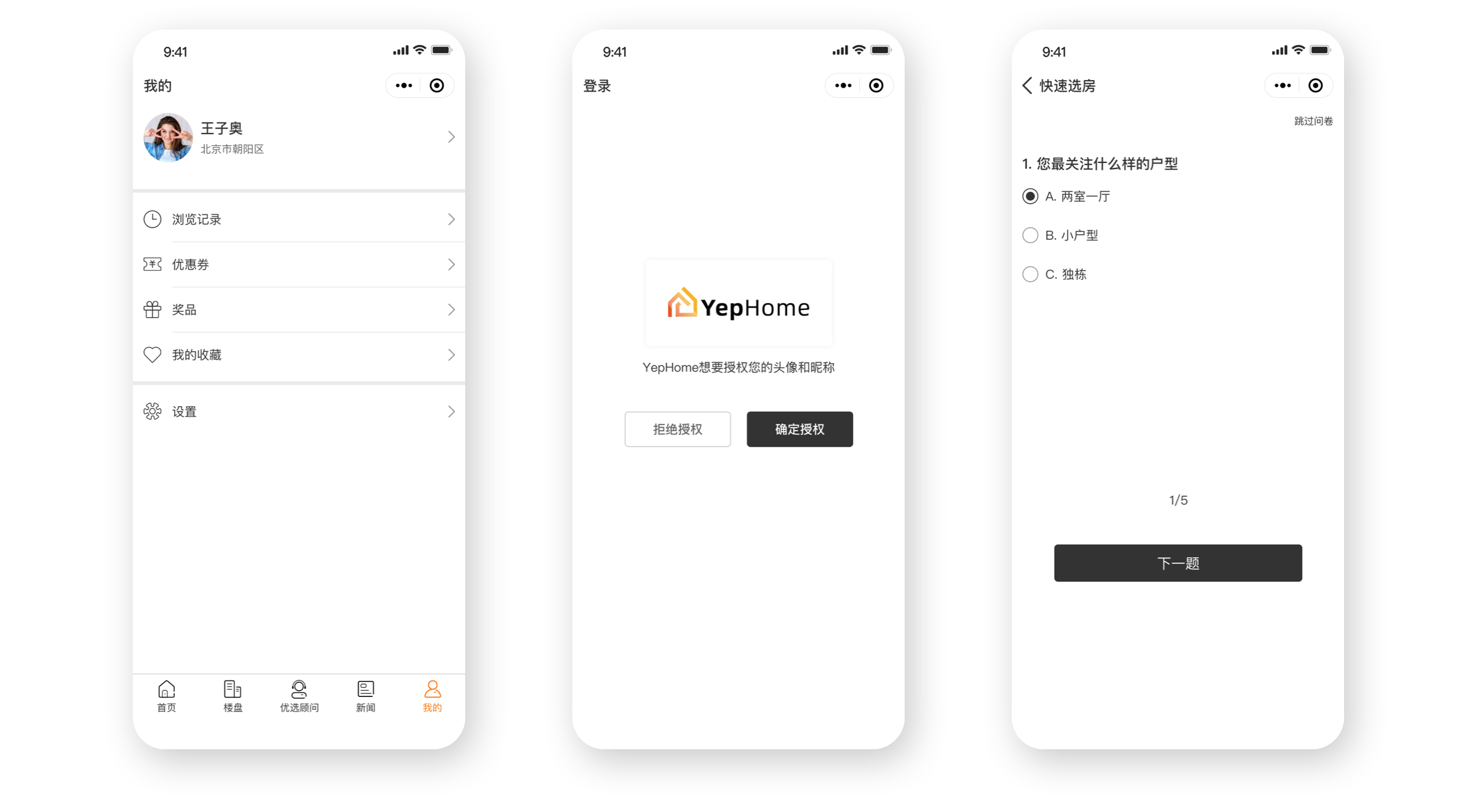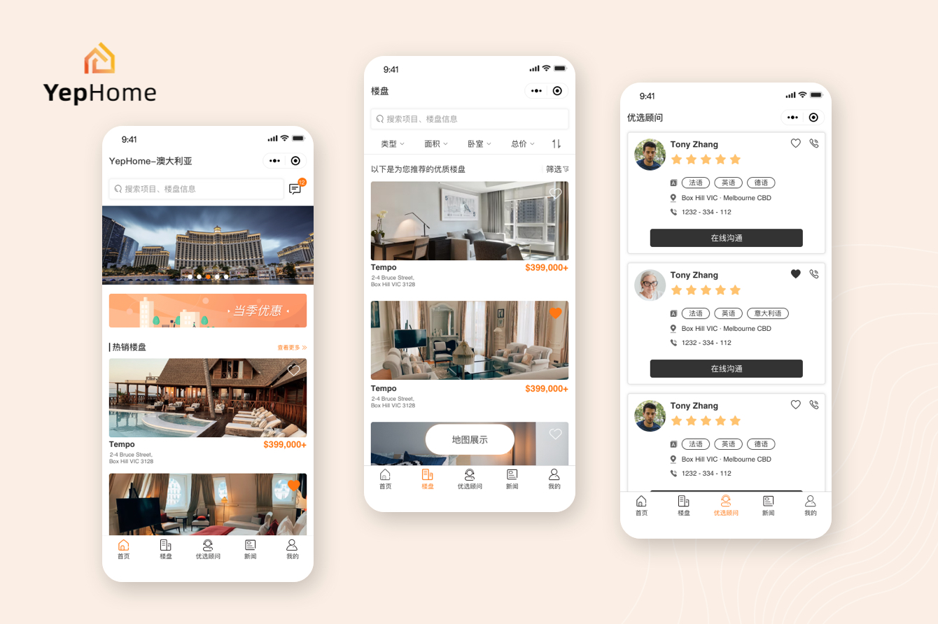 YepHome小程序,是北京合合科技承接的房屋中介線上平臺小程序,包括樓盤地理位置顯示、樓盤列表,線上云展廳推薦、與售樓顧問在線溝通、新聞資訊等等。