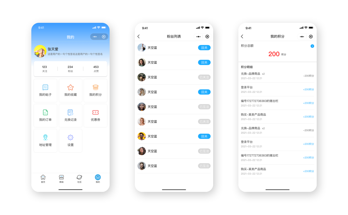 包括我的關(guān)注、粉絲、點贊等,我的貼子、收藏、積分、訂單、優(yōu)惠券、地址管理、設(shè)置等。