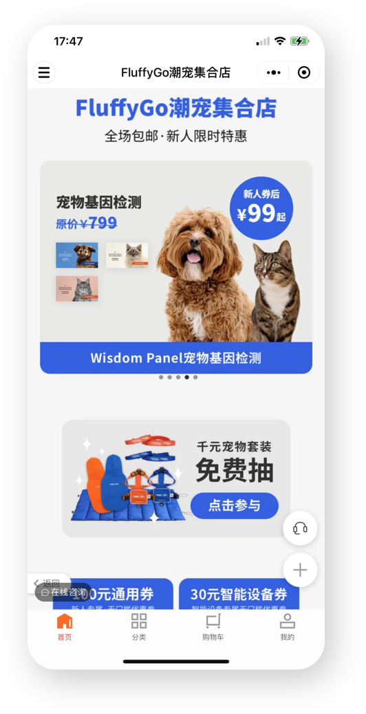 毛球總動(dòng)員商城頁面可以跳轉(zhuǎn)進(jìn)入寵物商城頁面,包括商品分類,主要有狗狗精選、貓咪精選、潮人精選等,包括加入購物車、我的頁面等。