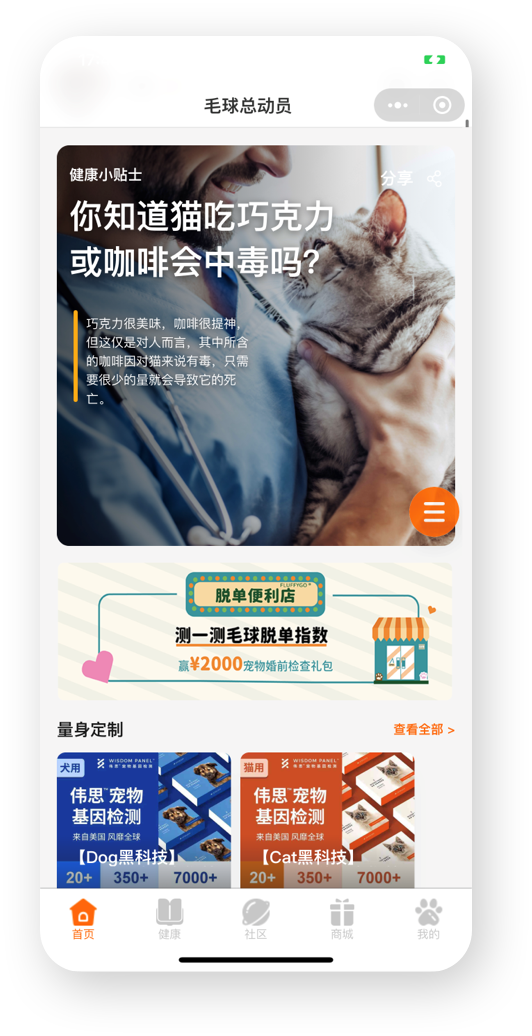 毛球總動(dòng)員首頁呈現(xiàn)的有輪播圖、脫單便利店、量身定制的寵物基因檢測、寵物護(hù)理專業(yè)課程、寵物相關(guān)的熱門活動(dòng)等。
