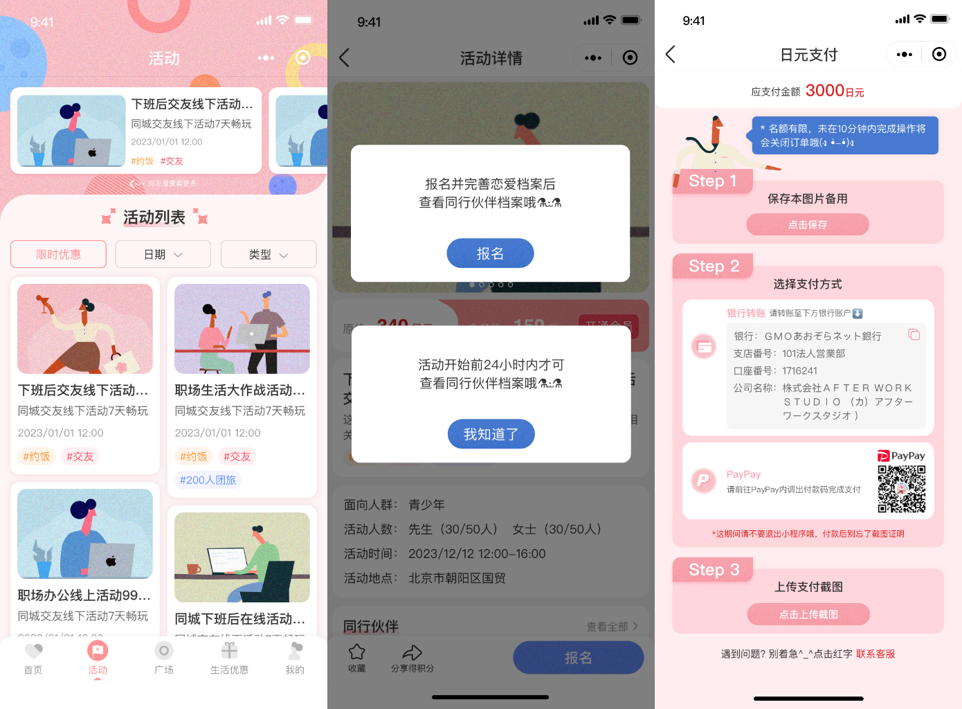脫單,職場,戶外旅游,吃飯聚會等,用戶線上付費報名,線下參加,同時分享活動邀請好友可獲得優(yōu)惠券可去線下指定商家享受折扣優(yōu)惠。
