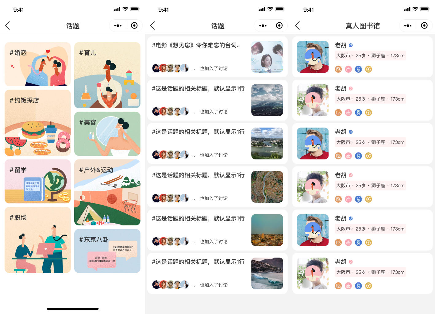 ①話題討論區(qū):由婚戀,約飯?zhí)降?,留學,職場,戶外運動,美容等板塊組成,大家可建立相應(yīng)板塊話題討論小組,加入討論小組進行發(fā)帖,可進行留言評論,點贊,轉(zhuǎn)發(fā)。