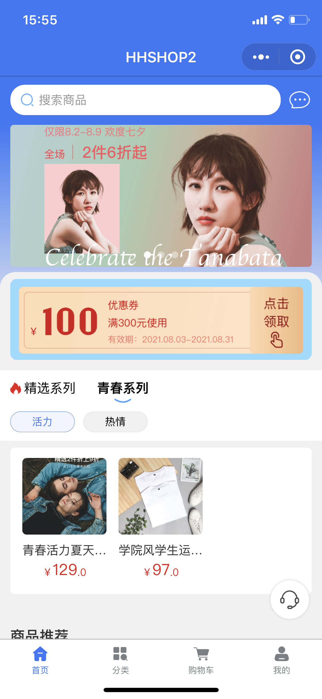 在“首頁”板塊,主要包括banner區(qū)、優(yōu)惠活動區(qū)以及系列主題分區(qū)。Banner區(qū)主要展示店鋪的優(yōu)惠活動的海報,或商品上新的海報,或其他熱銷商品的精美圖片,吸引用戶的注意力。商家可根據(jù)商品情況或活動進(jìn)度在后臺實時更新替換banner圖,為用戶提供最新資訊。